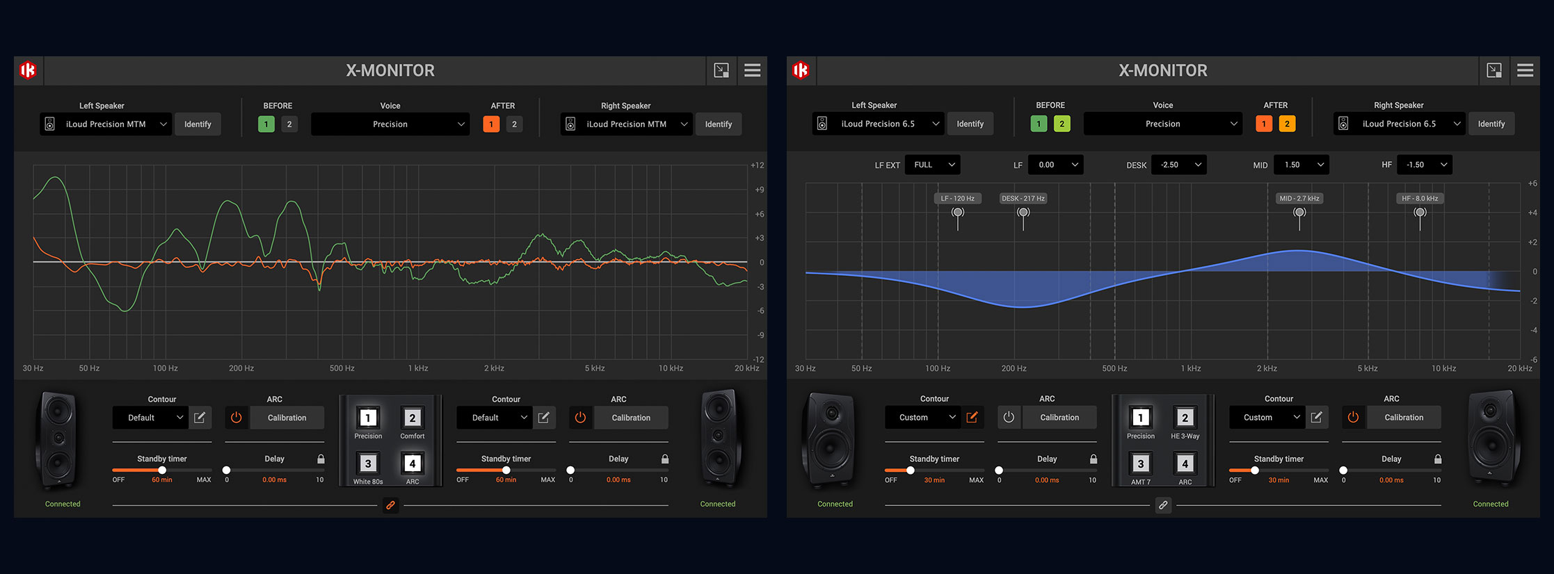 Precision 系列直接把 IK 自家的 ARC 房间校正系统内置到音箱里,随箱还送测量麦克风。只需几分钟,就能测出房间的声学问题,并自动补偿。