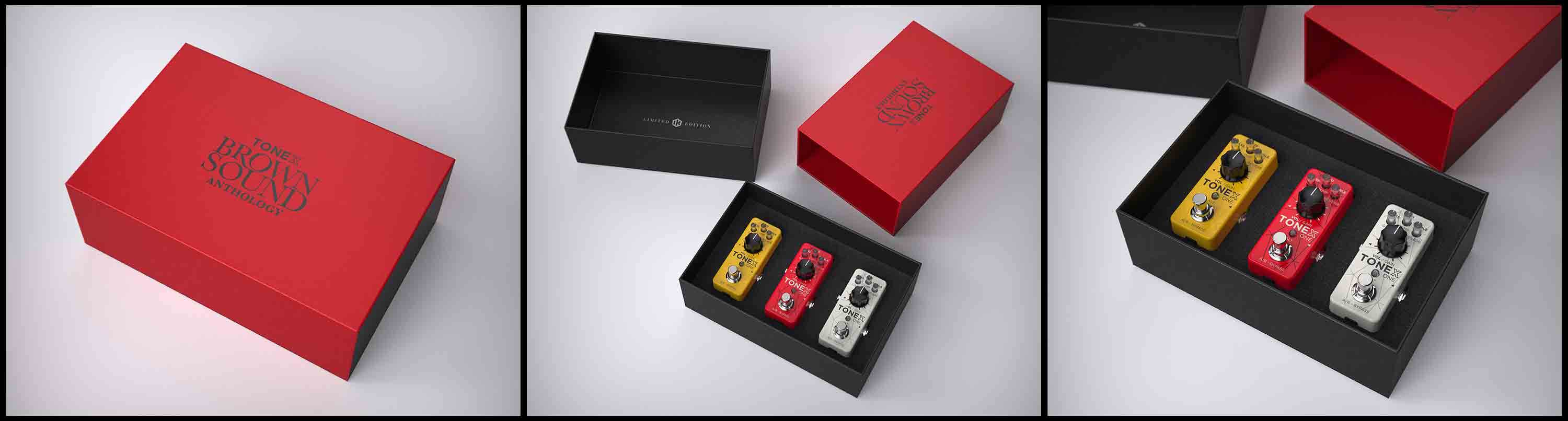限量版 Tonex One 效果器共有白、黄、红三种颜色可选,每款都包含 IK Multimedia Brown Sound Anthology 中三个音色库的 20 个预设,以及完整的 79/80 Brown Sound 音色库(该音色库模拟了 Van Halen I 和 II 的音色),此外还可选择另一个 Brown Sound 音色库,并附带 Tonex SE 软件。