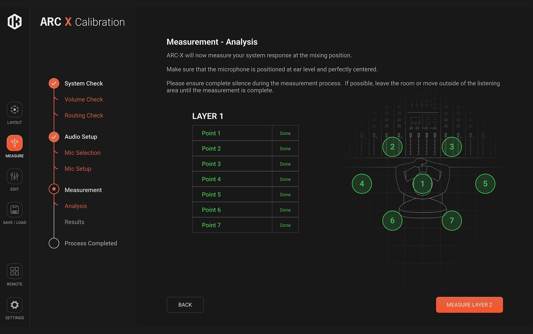 然后将麦克风固定在支架,放在聆听位置上,在ARC X 软件上点击校准按钮,会打开一个对话框,确认麦克风的存在并指示所需的测量位置。